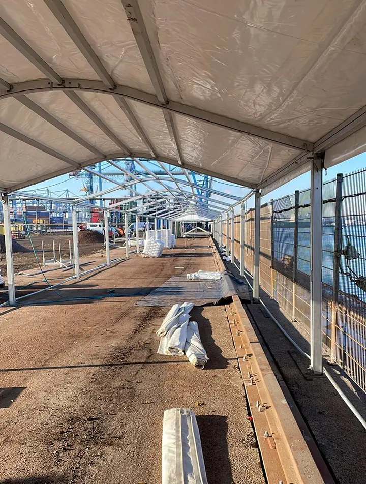 Een robuuste, tijdelijke overkapping die werkplekken beschermt tegen weersinvloeden.